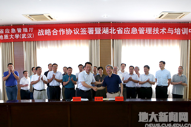 施政与王焰新在战略合作协议上签字。根据协议,双方将发挥各自优势,围绕湖北省应急管理事业改革发展,实现信息资源共享、优势互补和强强联合,在人才培养、学科研究、重大课题咨询、科技成果转化应用等方面开展合作,成立“湖北省应急管理技术与培训中心”,推动应急管理理论创新、制度创新、科技创新和管理模式创新,使之成为应急管理部门科学决策的“思想库”和“智囊团”。