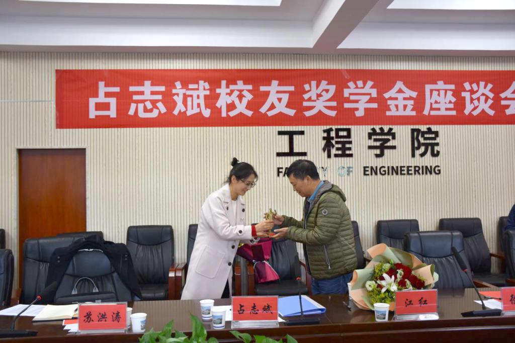 (通讯员:卓越 王焱)为凝聚校友力量,促进院校发展,落实感恩励志教育,11月18日下午,工程学院在工程楼315会议室召开“占志斌校友奖学金座谈会”。占志斌校友及夫人江红女士、校友工作与教育基金管理处处长徐岩、学生工作处副处长苏洪涛、工程学院姚爱国教授、工程学院党委书记陈飞、党委副书记江广长、勘察与基础工程系党支部书记段隆臣、校友工作与教育基金管理处丁苗苗、24名“占志斌校友奖学金”获奖学生代表参加座谈会。座谈会由工程学院副院长窦斌主持。