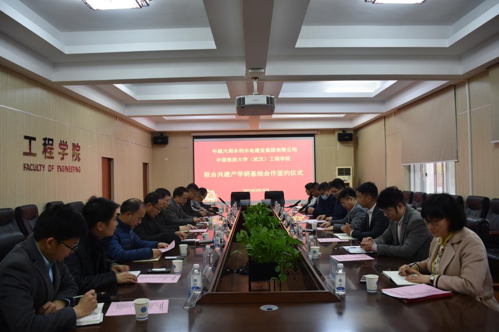 (通讯员:张美霞 文新)3月19日下午,我校1995级73951班校友、中建六局水利水电建设集团有限公司党委书记、董事长魏新颜,带领水利水电公司华北分公司、华南分公司、华中分公司、公司人力资源部负责人一行回到母校,在工程楼315就联合共建产学研基地进行了座谈并举行了签约仪式。中国地质大学(武汉)校友工作与教育基金管理处处长徐岩、工程学院院长焦玉勇、校社会合作办副主任袁江、科长张祎,工程学院陈建平教授、吴立教授等教师代表出席签约仪式。座谈会及签约仪式由工程学院院长焦玉勇主持。