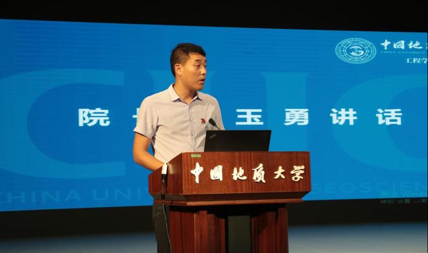 工程学院院长焦玉勇教授发言。他指出,工程学院是培养人才的重要阵地,七十年的厚积薄发,培养无数优秀学子、书写工程内涵。他强调,当今新时代面临着伟大变革,学子们要胸怀大志、秉持真理,不断拓宽视野,提升人文素养与科研能力;要立于当下,着眼未来,为攻克地质工程领域难题不懈奋斗、贡献力量;在求学之路上,要做良善之人、栋梁之材,培养完整人格,勇担时代使命。
