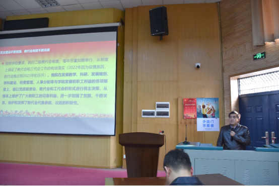 院长焦玉勇同志做学院工作报告,全面总结了学院取得的突出成绩和宝贵经验,认真剖析了学院发展过程中仍然存在的不足和亟待解决的问题。焦院长指出,2023年是“十四五”改革发展第三年,也是学院发展的关键时期,面临重大机遇,也迎来严峻挑战,学院将在习近平新时代中国特色社会主义思想的指引下,坚决贯彻落实党的二十大精神,团结一心、振奋精神、克服困难、努力工作、开拓进取,为建设地球科学领域世界一流大学,把工程学院建设成为地质工程与人居安全领域特色鲜明、享誉国际的一流研究型学院而接续奋斗!