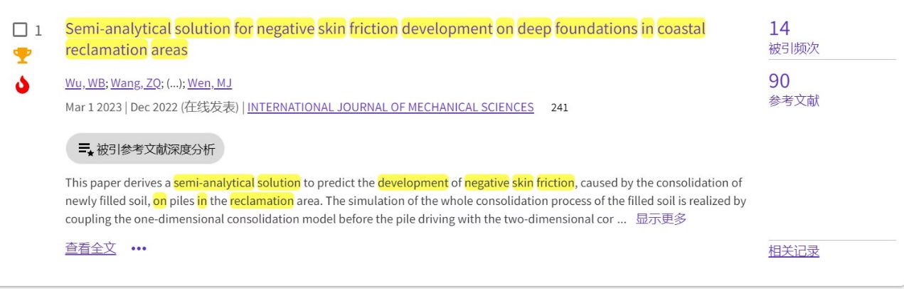 (通讯员 黄静)根据2023年7月基本科学指标数据库(Essential Science Indicators,简称ESI)最新数据显示,工程学院勘察与基础工程系吴文兵教授团队于2023年在国际工程力学领域权威期刊International Journal of Mechanical Sciences(IF: 7.3, 中科院一区TOP)上发表的学术论文“Semi-analytical solution for negative skin friction development on deep foundations in coastal reclamation areas”同时入选ESI热点论文和高被引论文。该论文第一作者为吴文兵教授,第二作者为勘察与基础工程系王宗琴硕士,中国地质大学(武汉)工程学院为第一署名单位。