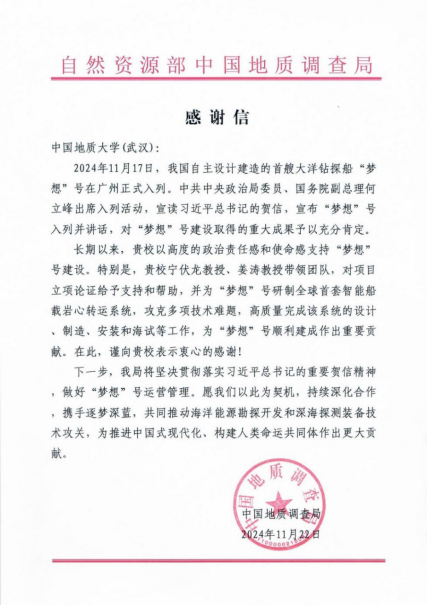 感谢信中指出,我校工程学院宁伏龙教授、海洋学院姜涛教授带领团队,对项目立项论证给予支持和帮助,为“梦想”号研制全球首套智能船载岩心转运系统,攻克多项技术难题,高质量完成该系统的设计、制造、安装和海试等工作,为“梦想”号顺利建成作出重要贡献。