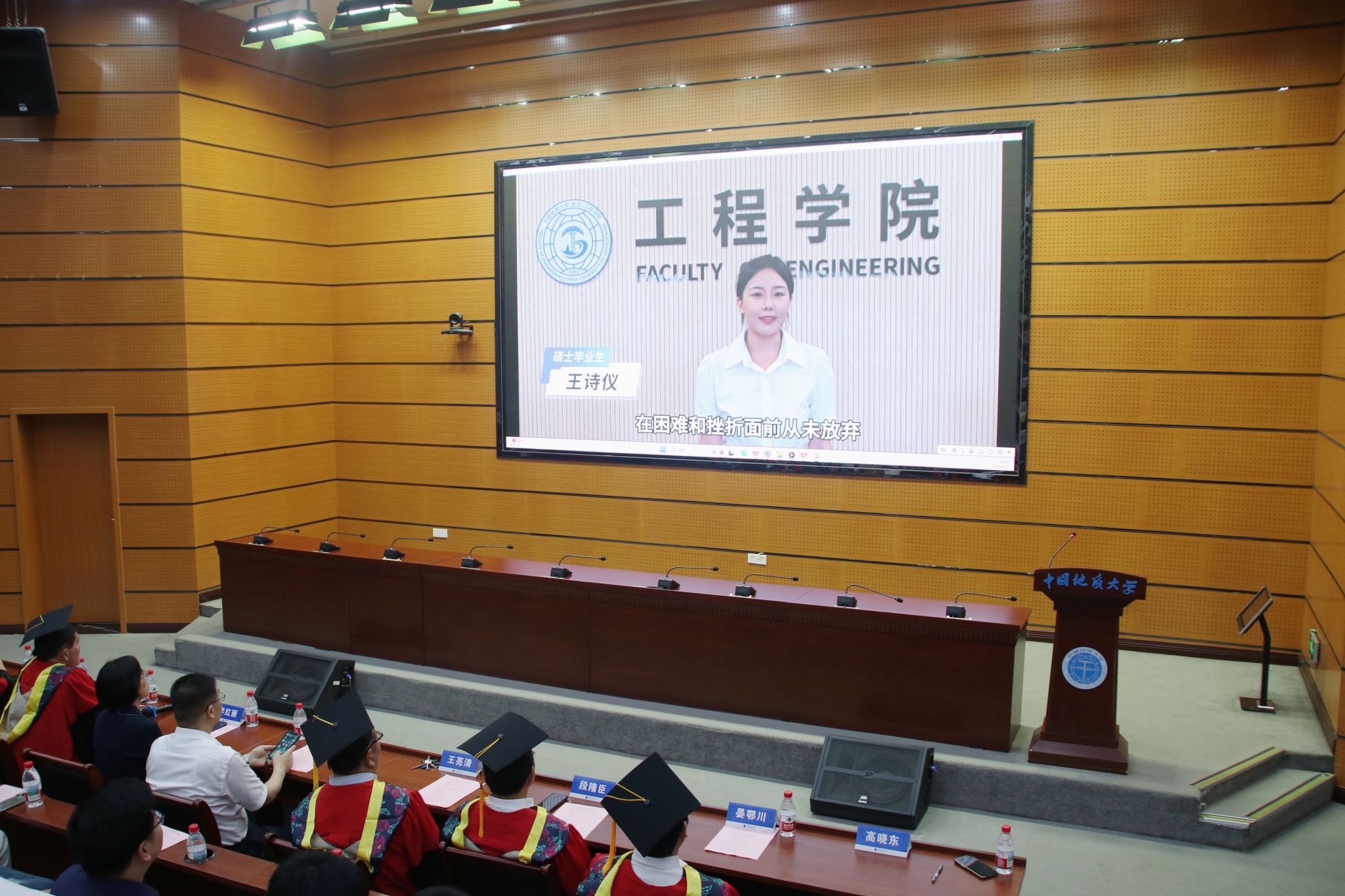 毕业研究生代表王海艳发言。她深情分享了过去三年在人工智能与地质灾害识别领域的科研成果以及在“挑战杯”赛场上斩金夺银的挑战成长与心路历程,希望同学们无论投身科研攻关、工程建设还是扎根基层都要以“专业报国、使命担当”为志,接续奋斗,勇攀高峰。