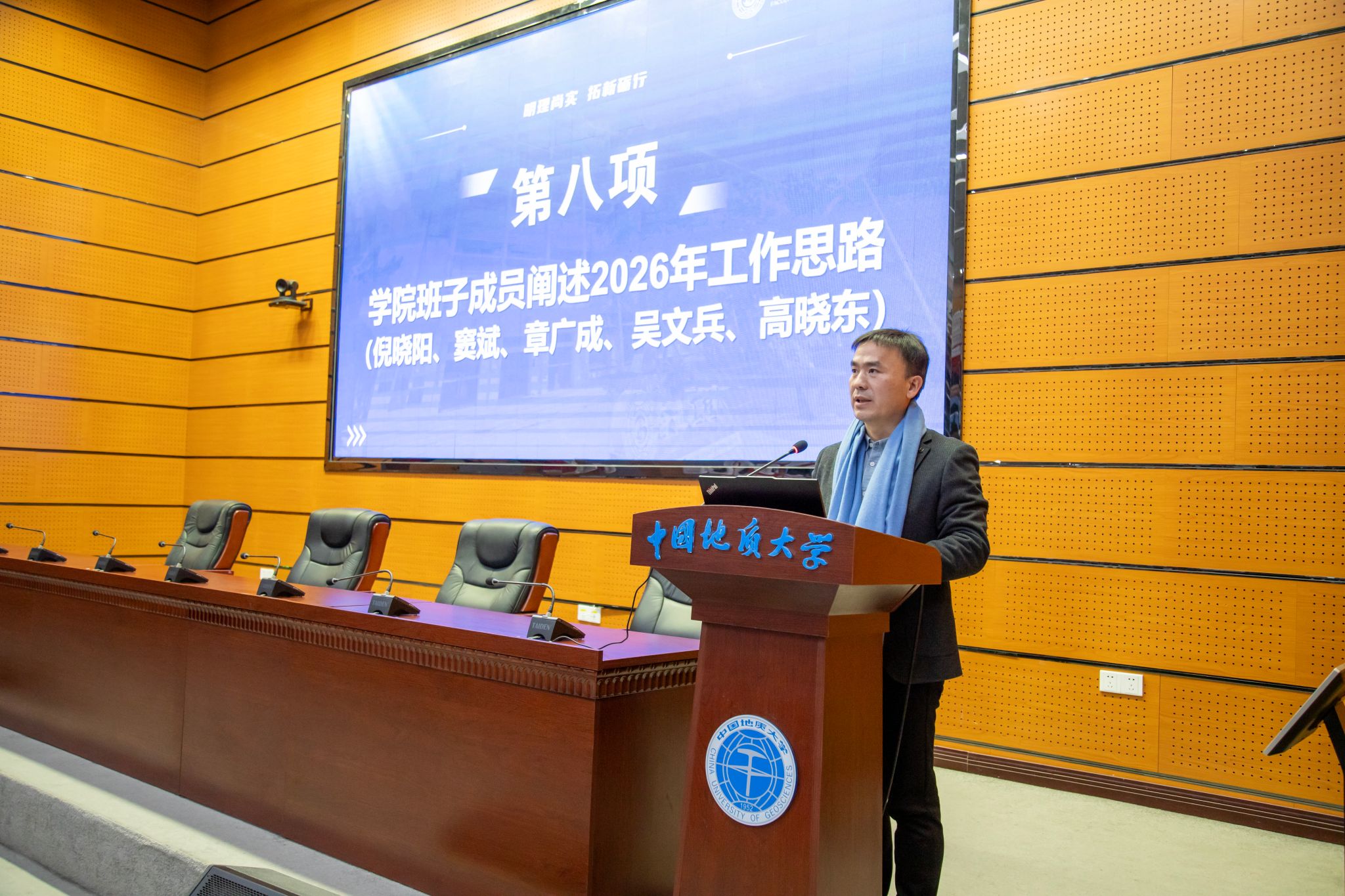 党委书记杨昌锐宣布年度报告大会决议后,学院其他领导班子成员倪晓阳、窦斌、章广成、吴文兵、高晓东相继阐述2026年工作思路。全院教师通过手机扫码的方式对工程学院2025年领导班子和机关作风满意度进行了测评。会场上蓝围巾组成的行列如严谨的工程矩阵,昭示着集体的力量。