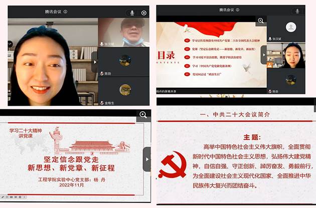 (通讯员 张汉斌)11月25日上午,工程学院实验中心党支部开展了支部主题党日活动。本次活动主题是“学习宣传贯彻落实党的二十大精神”。本次活动采取线上腾讯会议形式,与安全工程专业本科生党支部党员代表联合开展,实验中心入党积极分子鲁莎同志列席了会议。活动由实验中心党支部支部书记杨丹同志主持。